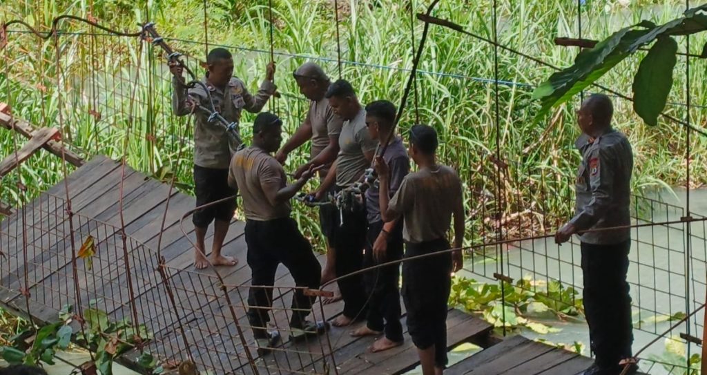 Sementara itu, personel Brimob lainnya menjalankan tugas tak kalah krusial. Sebagian prajurit terlihat menyulam kembali besi sling jembatan yang putus, merangkainya satu per satu dengan presisi.